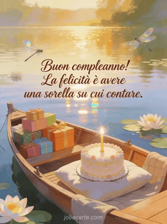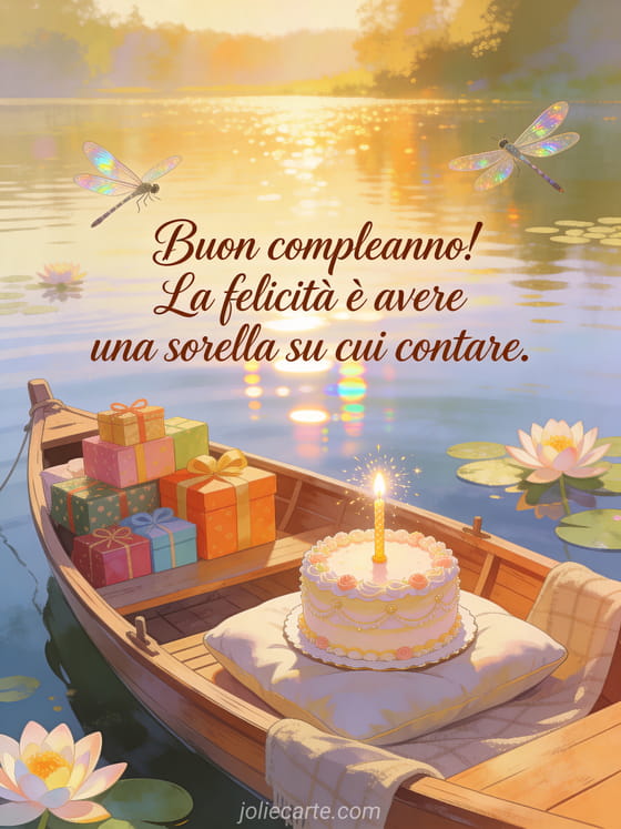 Festeggia il compleanno di tua sorella con questo poetico biglietto con una barca di legno su un lago calmo con ninfee, regali colorati e un'elegante torta con candelina scintillante nella luce dorata del mattino. Scopri anche un biglietto di compleanno per sorella o un biglietto di compleanno per una sorella.