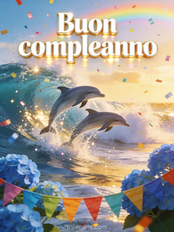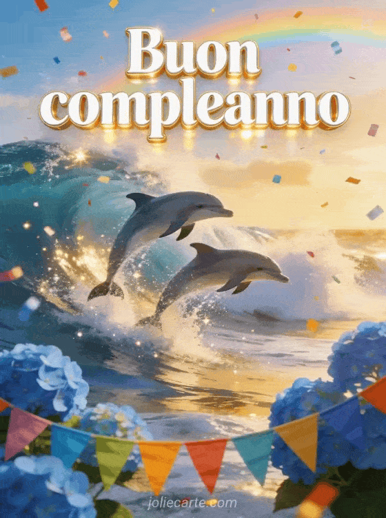 Festeggia un compleanno con questo gioioso biglietto animato con delfini che saltano sopra onde scintillanti, ortensie blu, coriandoli colorati, una ghirlanda festiva e un arcobaleno leggero in un cielo dorato. Scopri anche un biglietto animato di compleanno con cane o un biglietto virtuale animato di compleanno.