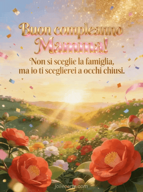 Festeggia il compleanno della tua mamma con questo radiante biglietto con una valle fiorita all'alba dorata con camelie rosse vibranti, pioggia di glitter dorato e coriandoli colorati nella luce del mattino. Scopri anche un biglietto di auguri per mamma o un biglietto per la migliore mamma.