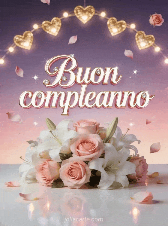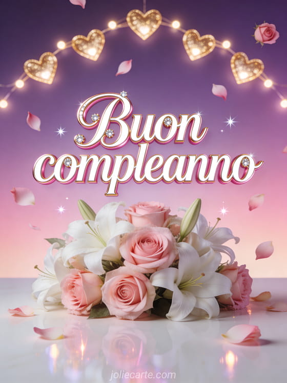 Festeggia un compleanno con questo lussuoso biglietto con eleganti rose rosa e gigli bianchi, luci fatate a forma di cuore oro rosa, petali che cadono e stelle scintillanti su uno sfondo sfumato malva-rosa. Scopri anche un gif di compleanno per adolescente o un biglietto di compleanno per adolescenti.