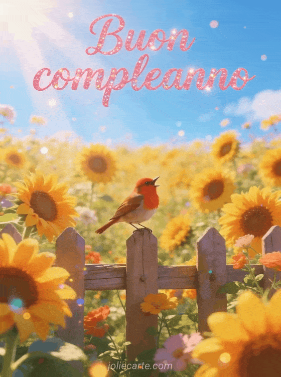 Festeggia un compleanno con questo gioioso biglietto con un luminoso campo di girasoli sotto un cielo azzurro estivo, un pettirosso appollaiato su uno steccato di legno che canta allegramente e caldi raggi di sole. Scopri anche un biglietto di compleanno con fiori gif o un gif musicale di buon compleanno.