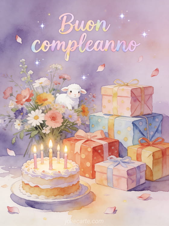 Rallegra il compleanno di qualcuno con questo adorabile biglietto in acquerello con un dolce agnellino bianco circondato da regali colorati e una torta con candeline accese. Scopri anche un biglietto di compleanno animato gratis o un biglietto di compleanno animato per bambini.