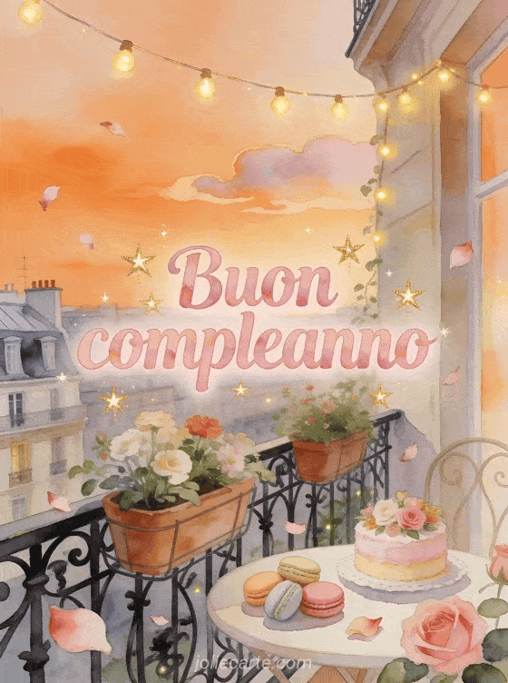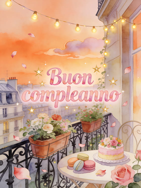 Festeggia un compleanno speciale con questo incantevole biglietto che mostra un balcone parigino al tramonto, macarons colorati e una torta decorata con fiori. Scopri anche un biglietto di compleanno per ragazza o un immagine di buon compleanno per teenager.
