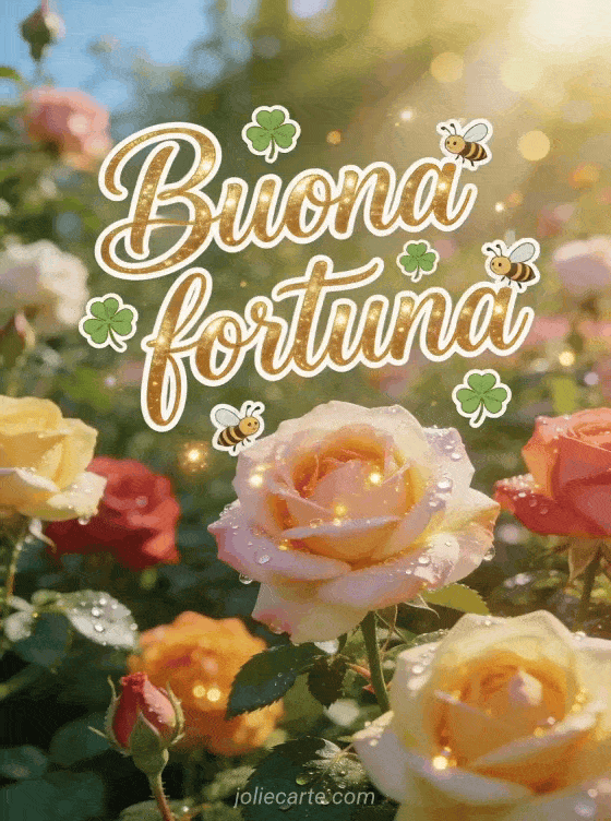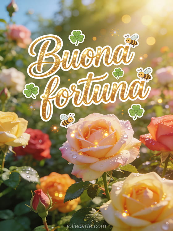Augura buona fortuna con questa gioiosa cartolina con lettere dorate, quadrifogli e api in un roseto in fiore bagnato dalla luce del mattino. Scopri anche una cartolina buona fortuna o una cartolina auguri buona fortuna.