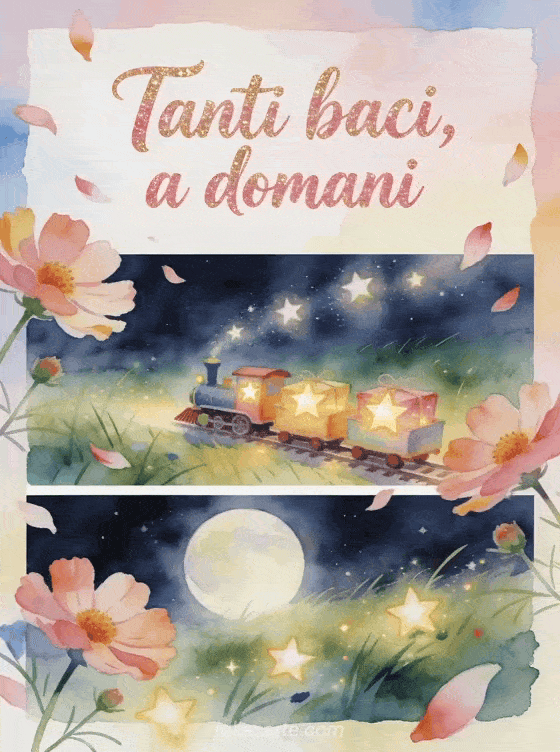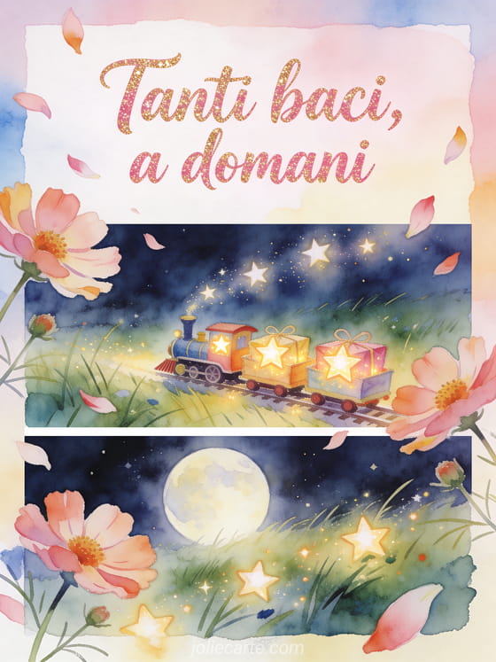 Condividi un addio sognante con scritte rosa oro ad acquerello, fiori di cosmos che attraversano il bordo, un piccolo trenino giocattolo che porta pacchi di stelle luminose in un prato al chiaro di luna e colori vivaci e giocosi. Scopri anche un biglietto baci e a domani immagine, un biglietto baci animati a domani o un biglietto tanti baci a domani gif.
