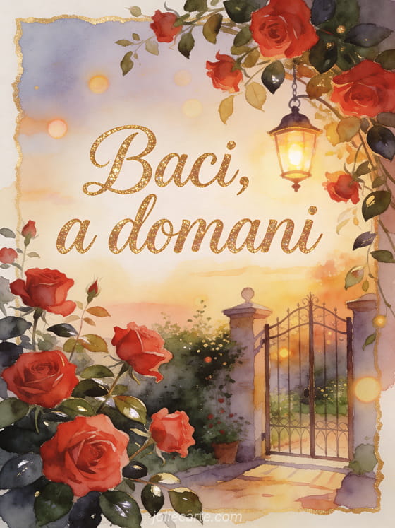 Condividi una promessa dolce per a domani con scritta arrotondata ad acquerello, rose rosse oltre il bordo, foglie lucide, un cancello da giardino accogliente e una lanterna accesa. Scopri anche un biglietto baci a domani, un biglietto baci a domani gif o un biglietto a domani baci immagini.