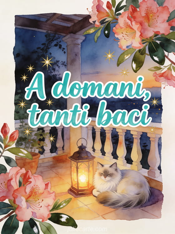 Condividi un saluto accogliente della sera con scritte turchesi, fiori di rododendro e un gatto angora turco acciambellato accanto a una lanterna luminosa in una veranda tranquilla. Puoi inviare anche dai baci a domani, gif bacioni a domani o a domani baci immagine.