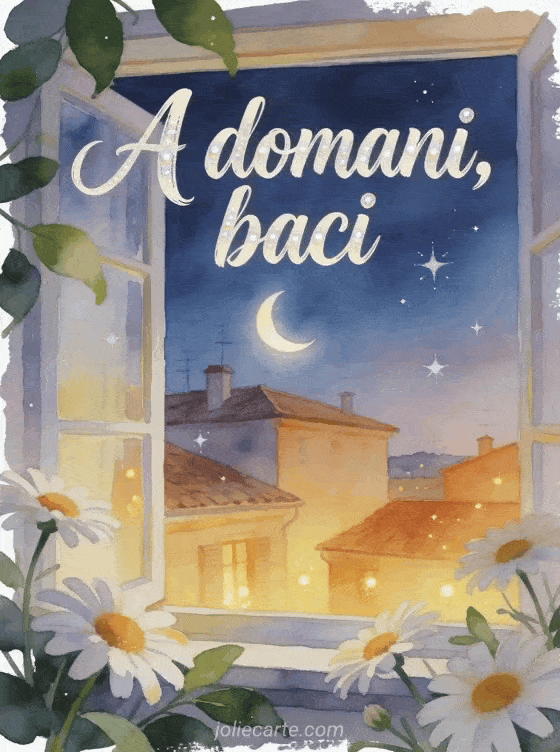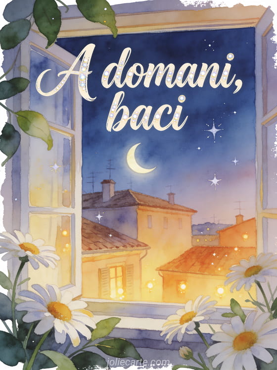 Invia un messaggio dolce di a domani con margherite ad acquerello, una luna crescente e luci calde sui tetti. Scopri anche un biglietto coraggio a domani, un biglietto ciao a domani o un biglietto buona giornata a domani.