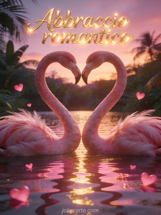 Invia questa romantica cartolina con le parole Abbraccio romantico scritte in lettere dorate corsive con effetto luce calda, con due fenicotteri che formano un cuore con i loro colli in un lago al tramonto, con riflessi rosa e dorati nell'acqua. Scopri anche una cartolina abbraccio coppia innamorata dormire o una dolcezza immagine abbraccio tenerezza.