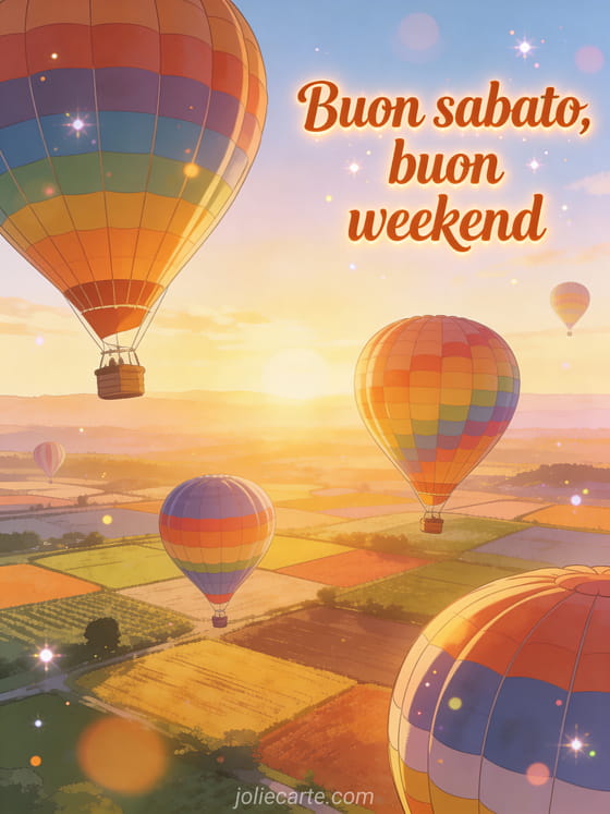 Condividi un caldo saluto di buon sabato e buon weekend con mongolfiere colorate che fluttuano sopra la campagna e campi a mosaico all'alba. Scopri anche buongiorno buon sabato baci, paesaggio buon sabato paesaggio o buon sabato divertente.