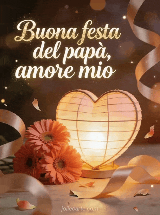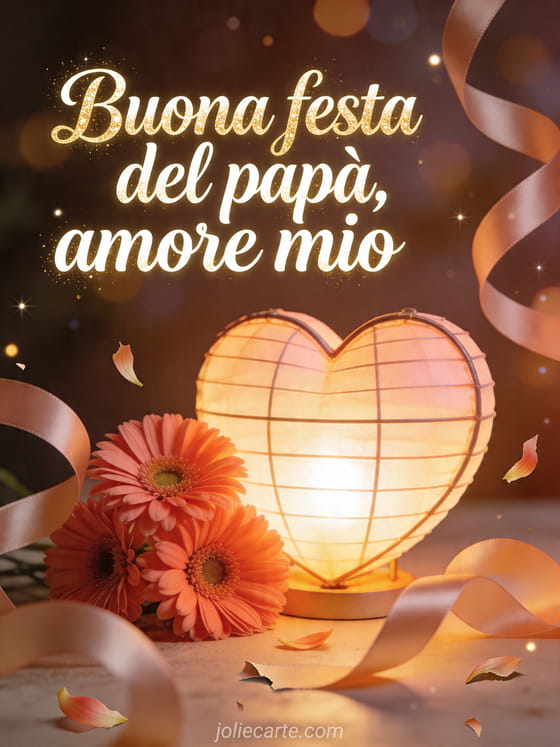 Invia un augurio romantico di buona festa del papĂ amore mio con una lanterna fotorealistica a forma di cuore che brilla accanto a gerbere corallo, nastri di raso e bokeh scintillante. Scopri anche un biglietto personalizzato Festa del PapĂ , tanti auguri festa del papĂ o un biglietto facile per la Festa del PapĂ .