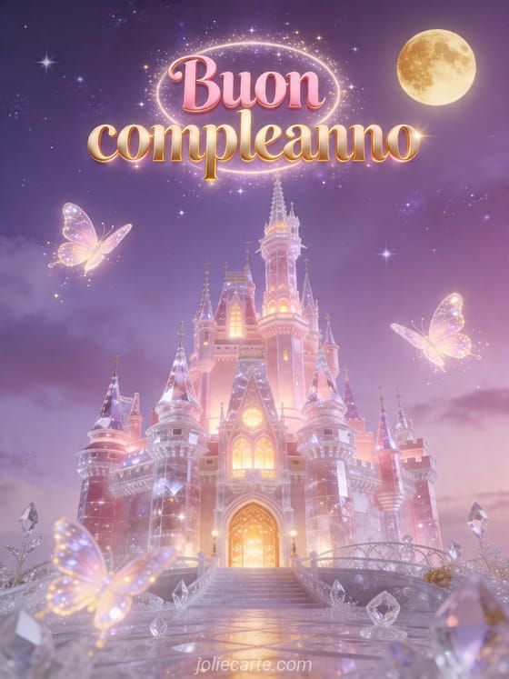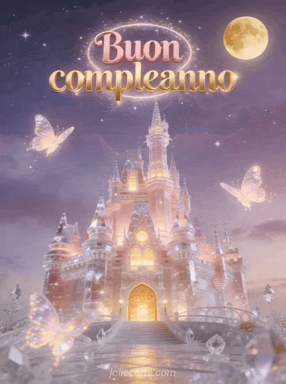 Condividi un buon compleanno incantato con questa cartolina fiabesca con un castello di cristallo rosa illuminato, farfalle magiche e una luna dorata in un cielo stellato. Puoi anche scoprire gif animati gratis compleanno, carta compleanno animata gratis musicale uomo o animato buon compleanno ragazzo gif.