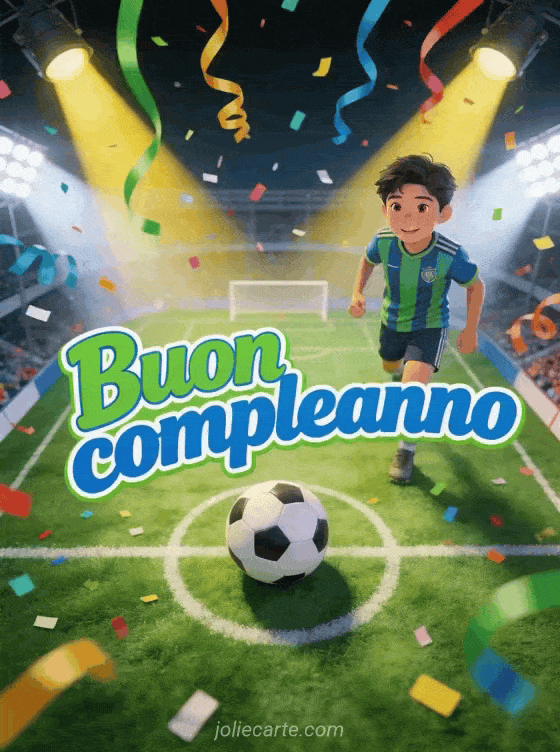 Festeggia un ragazzo con questa dinamica cartolina di compleanno con campo da calcio visto dall'alto, pallone sul prato, coriandoli e forti luci dello stadio. Puoi anche scoprire carta compleanno animata 1 anno, cartoline animate di compleanno jolie carte o e-card compleanno animata.