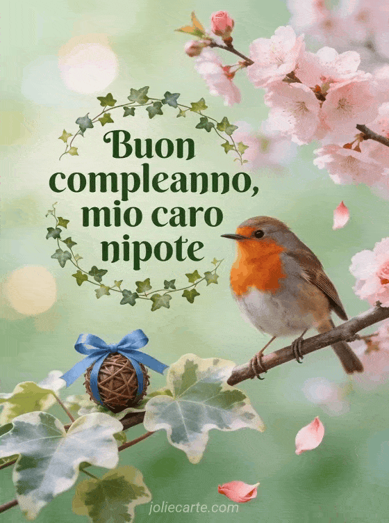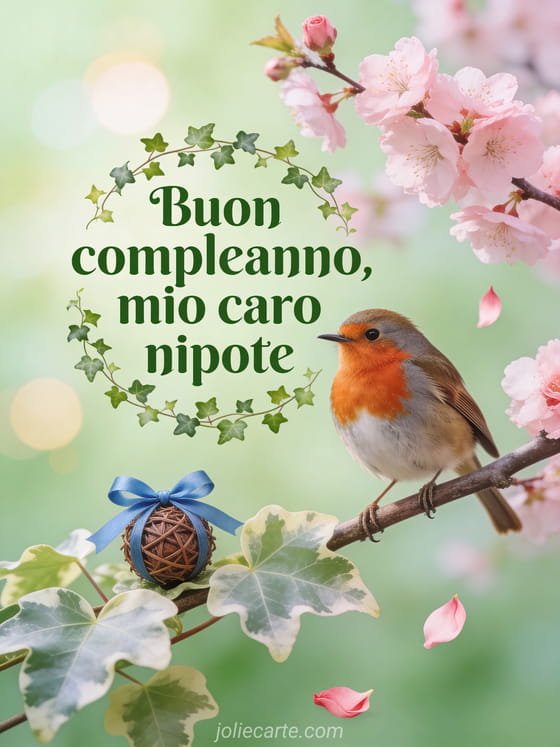 Augura buon compleanno al tuo caro nipote con un pettirosso posato su un ramo di ciliegio in fiore, un piccolo nido con nastro blu e petali che cadono dolcemente. Scopri anche auguri di compleanno per mio nipote, risata senza gioia o testo di compleanno per mio nipote.
