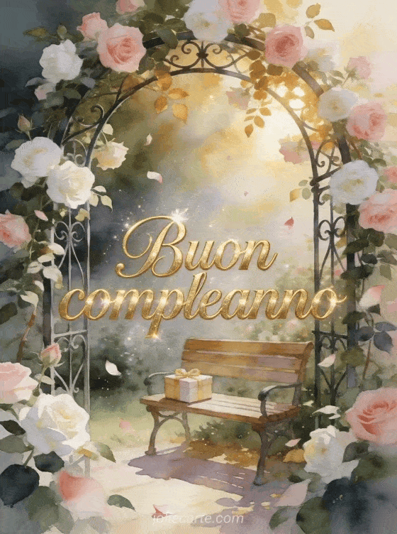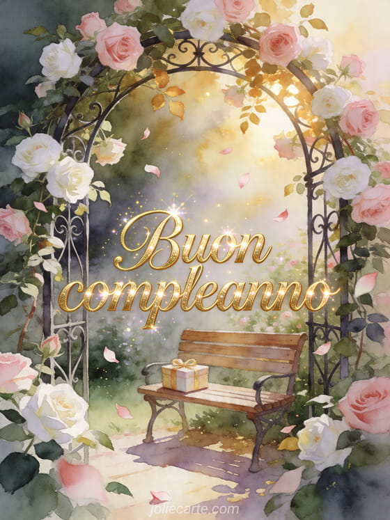 Condividi un augurio di compleanno romantico con questo dettagliato biglietto ad acquerello con rose rampicanti, una panchina di legno, un regalo e luce dorata in un giardino inglese. Scopri anche carta buon compleanno, foto buon compleanno e buon compleanno.