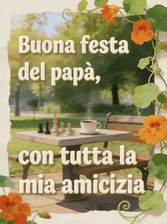 Condividi un biglietto illustrato e amichevole per la Festa del Papà con un tavolo soleggiato al parco, una tazza di caffè fumante, pezzi degli scacchi e vivaci tralci di cappuccina che superano il bordo dell'immagine. È un modo caloroso per inviare amicizia e auguri. Scopri anche gif originale per la Festa del Papà, amore mio mio caro buona festa del papà o un biglietto personalizzato Festa del Papà.