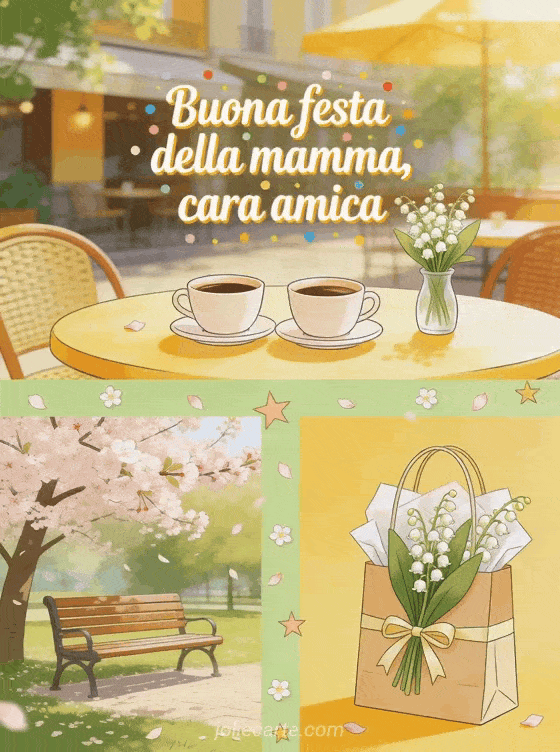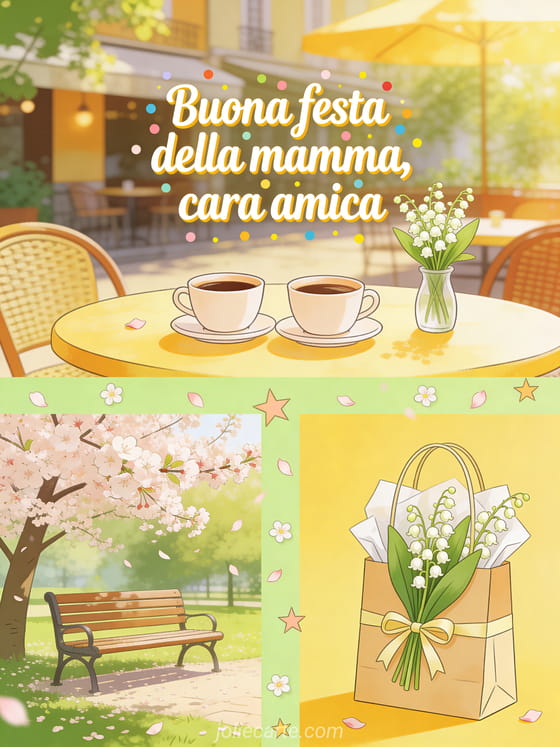 Condividi un biglietto caloroso per la Festa della Mamma dedicato a un'amica speciale con un collage primaverile. Scopri anche disegno per la festa della mamma, immagine buona festa della mamma citazioni e invito per festa della mamma.