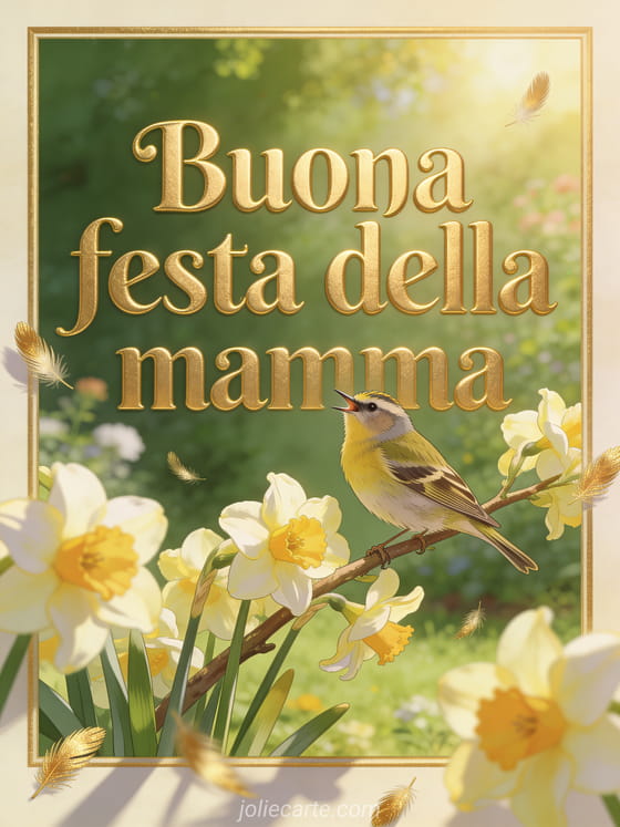 Condividi questo gioioso augurio per la festa della mamma. Un verzellino posato su narcisi in fiore canta nella calda luce primaverile con un morbido sfondo verde di giardino. Scopri anche un biglietto originale festa della mamma o una cartolina gratis festa della mamma.