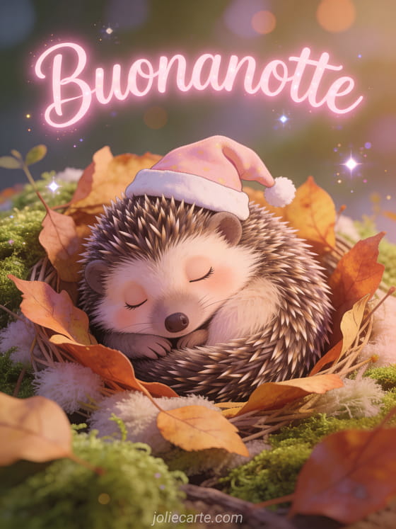 Invia un'immagine tenera per augurare buonanotte al tuo amore con questa adorabile cartolina gratis. Un dolce riccio con un cappellino da notte arrotolato in un accogliente nido di foglie autunnali e muschio soffice, per una buonanotte tenera. Scopri anche una cartolina buonanotte messaggio amore immagine o una cartolina parole d'amore per dire buonanotte.