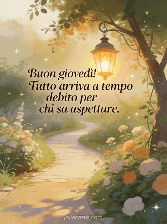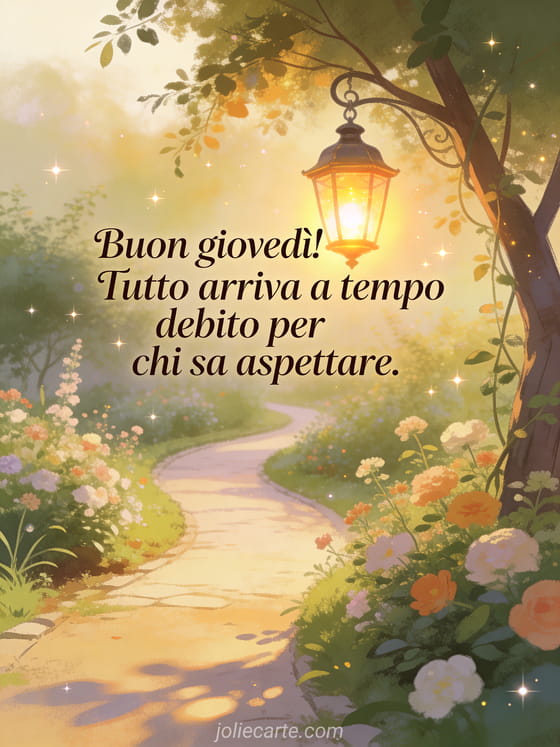 Condividi un messaggio riflessivo di buon giovedì con scritta raffinata, bagliore caldo, un sentiero tortuoso di giardino, una lanterna all'alba, luce dorata soffusa e scintille delicate. Scopri anche buona giornata giovedì, buon giovedì gatto o buon giovedì messaggio.
