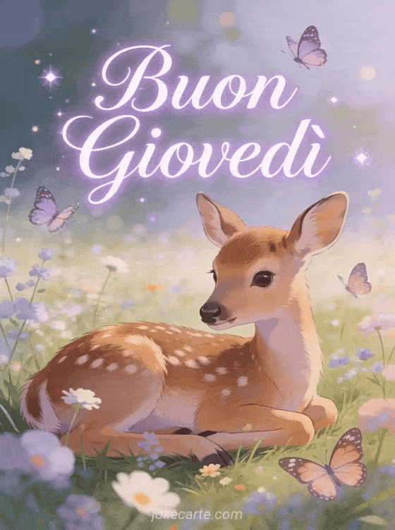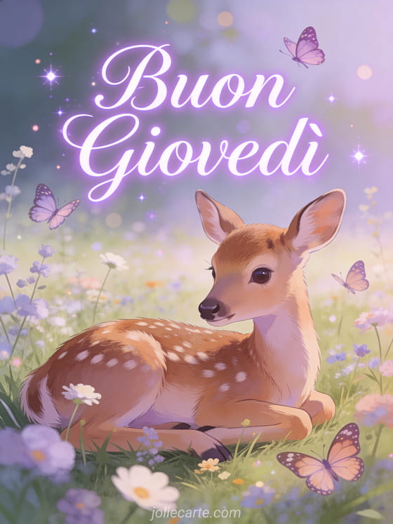 Augurate un buon giovedì con questo sereno biglietto virtuale. Un adorabile cerbiatto riposa in un prato di fiori selvatici con farfalle in una dolce scena pastorale. Scoprite anche un biglietto di buon giovedì, un biglietto di buon giovedì con baci o un biglietto di buon giovedì.