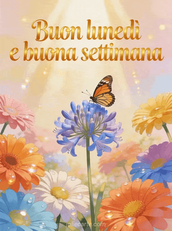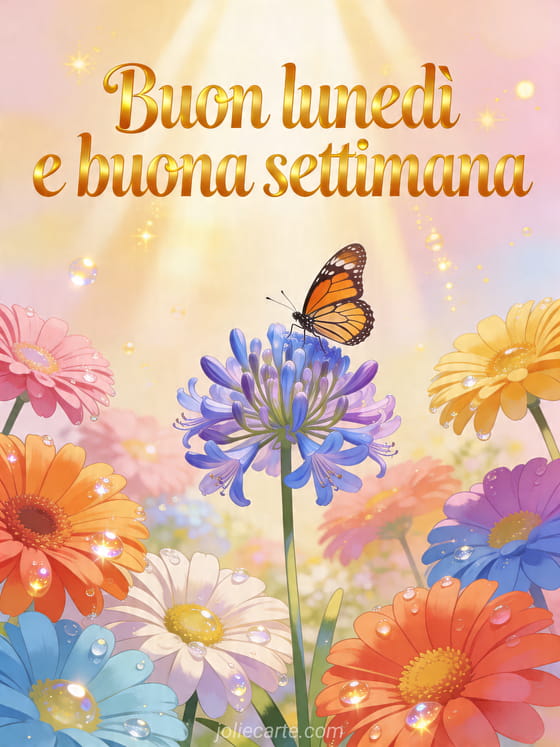 Invii un luminoso messaggio di buon lunedì e buona settimana con questo radioso biglietto che mostra gerbere colorate, un agapanto e una farfalla monarca. Scopra anche buongiorno buon lunedì buongiorno buona settimana, immagini caffè buon lunedì o foto buon lunedì.