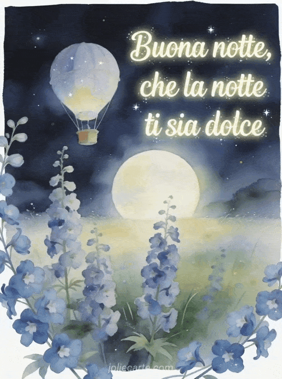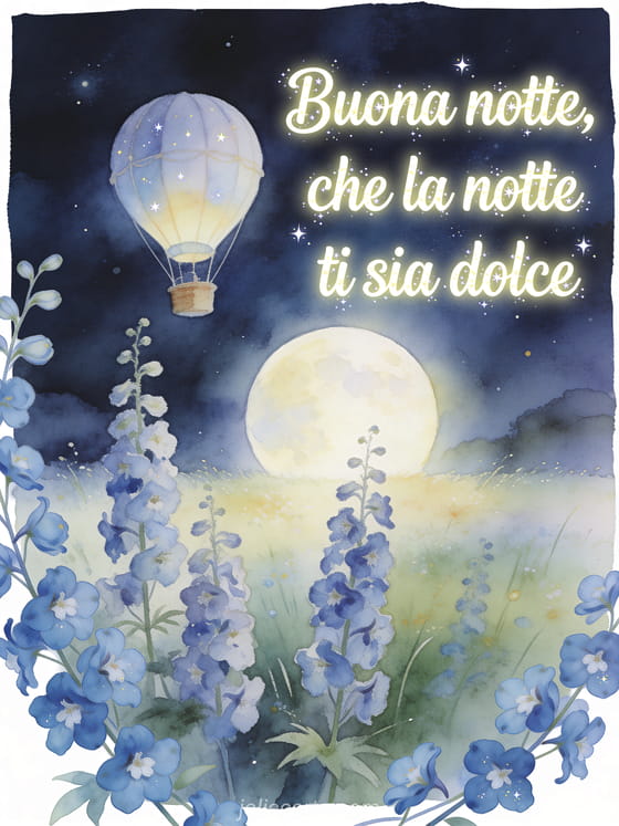 Invia un augurio sognante di buona notte con scritte avorio, una mongolfiera sopra un prato al chiaro di luna, fiori blu di delfinio e bokeh delicato. Scopri anche cartoline virtuali animate gratis della buonanotte, uno splendido messaggio di buonanotte o un buonanotte messaggio SMS.