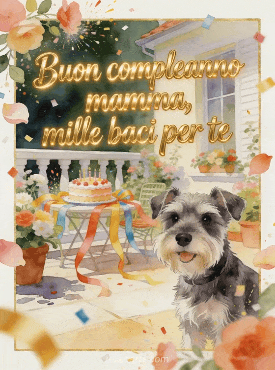 Invia alla mamma un augurio vivace di compleanno con lettere dorate calde, un cane schnauzer nano, petali sciolti, coriandoli, una torta decorata, nastri luminosi e un patio pieno di fiori. Puoi condividere anche un buon compleanno mamma gif scintillante, un buon compleanno mamma testo di compleanno o un buon compleanno mamma gif.