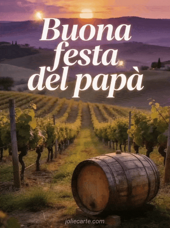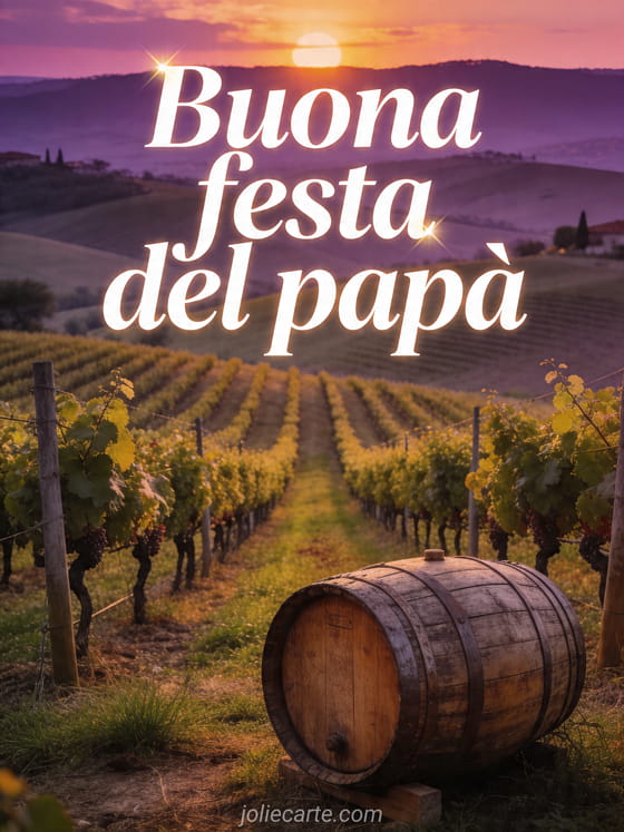 Condividi auguri festa del papĂ con un vigneto fotorealistico al tramonto, filari di viti su colline ondulate, cielo viola e dorato e una vecchia botte in legno in primo piano. Scopri anche una citazione breve festa del papĂ , un biglietto buona festa papĂ o una buona Festa del PapĂ gif.