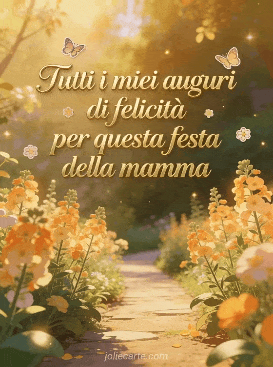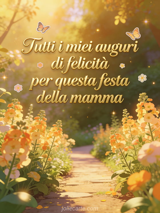Condividi i tuoi più calorosi auguri per la festa della mamma con questo bellissimo biglietto con elegante scrittura dorata e un sereno vialetto di giardino pieno di emerocallis. Scopri anche buona festa della mamma immagine o cartolina festa della mamma fiori.