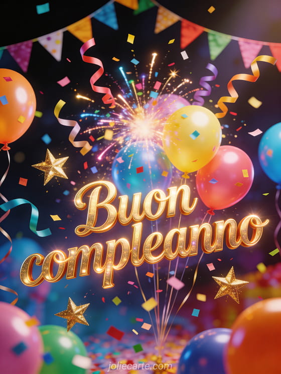 Festeggia un compleanno con questo vivace biglietto con lettere dorate festive, un'esplosione di coriandoli multicolori e stelle filanti, palloncini colorati e stelle dorate scintillanti. Scopri anche un biglietto di compleanno con golden retriever o un biglietto di compleanno con gatto.