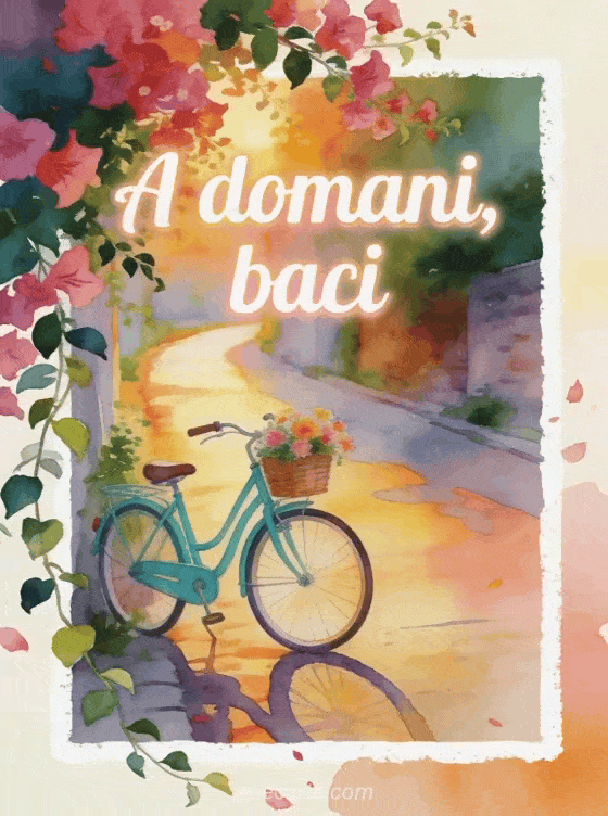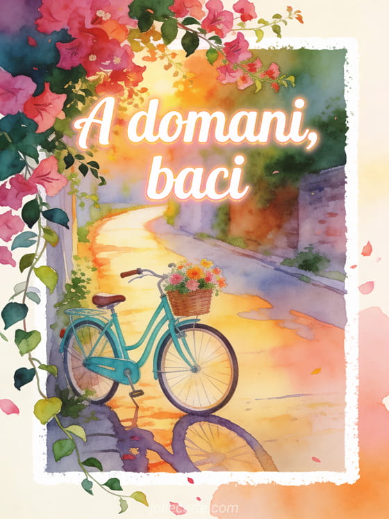 Condividi un saluto luminoso della sera con scritte leggere ad acquerello, bouganville che supera il bordo e una bicicletta turchese con cestino di fiori accanto a un vicolo caldo di sole. Scopri anche un baci a domani gif, un biglietto a domani baci immagini o un saluto coraggio a domani.