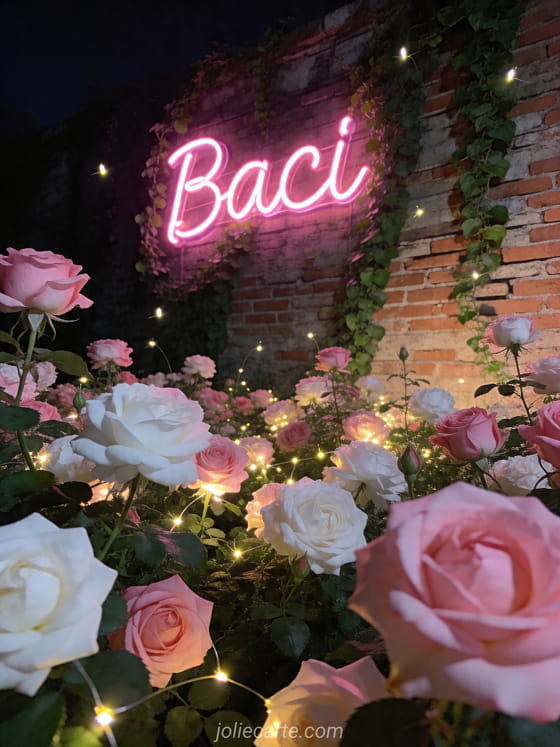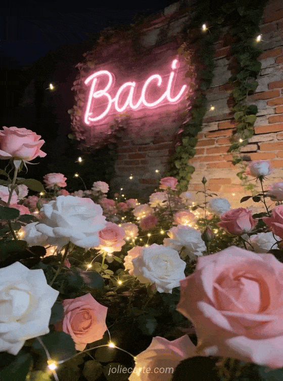Condivida un tenero messaggio di baci con questo romantico biglietto che mostra malvarose rosa e bianche in un giardino notturno con lucciole. Scopra anche baci d'amore coppia, immagine baci o loghi animati baci.