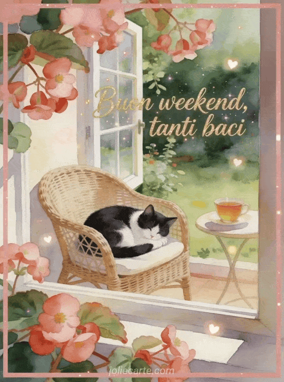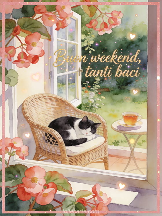 Augura un weekend tranquillo con scritte oro rosa, begonie oltre il bordo e un gatto bianco e nero acciambellato su una poltrona in rattan accanto a una finestra aperta sul giardino. Puoi inviare anche buon weekend e baci immagine, bacio grande buon weekend baci o gif buon weekend bacioni.