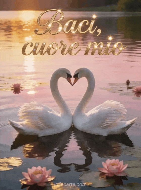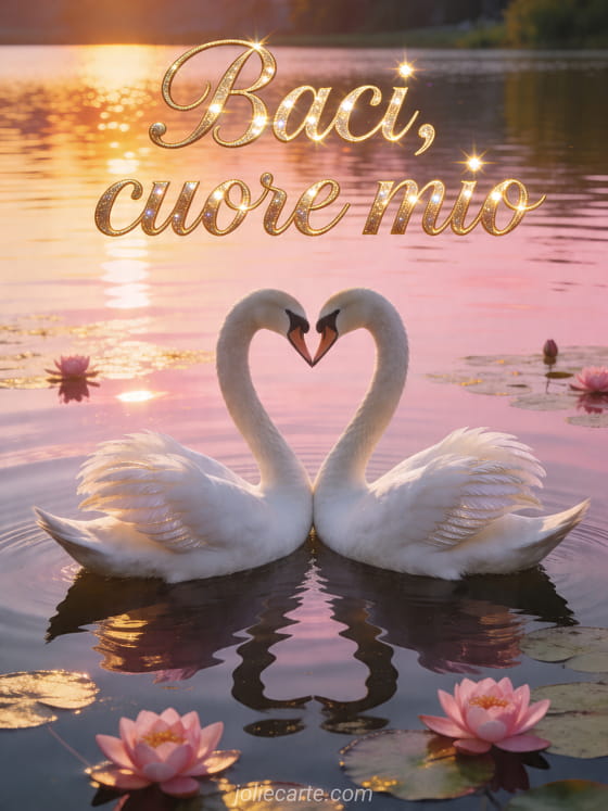 Condivida un affettuoso messaggio di baci con questo romantico biglietto che mostra due cigni bianchi formare un cuore su un lago tranquillo al tramonto. Scopra anche baci ai gratis, baci d'amore coppia o baci gif.