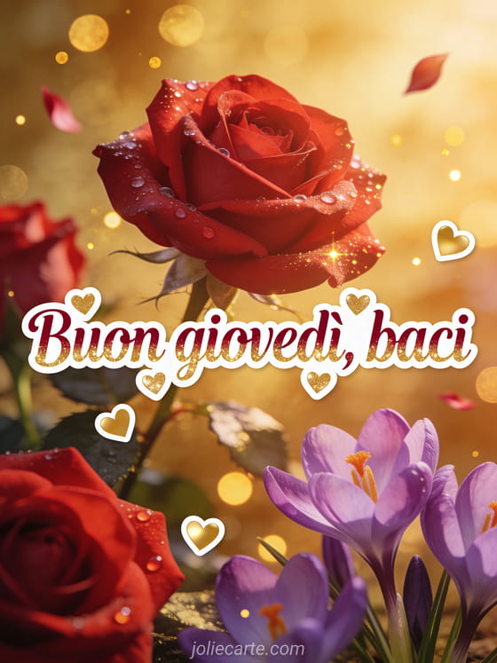 Invia un biglietto romantico di buon giovedì, baci con lettere eleganti bordeaux, cuori dorati, crocus viola delicati, rose rosse con rugiada scintillante e luce calda della golden hour. Scopri anche buon giovedì sotto la pioggia gif, buongiorno buon giovedì immagine o buongiorno buon giovedì baci immagini.