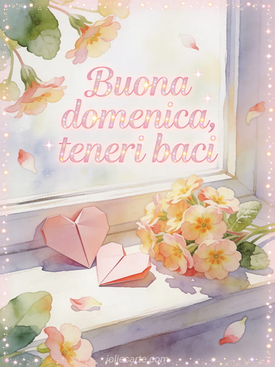 Invia buona domenica, teneri baci con lettering rosa, cuori di carta piegati e primule su un davanzale luminoso. Scopri anche buona domenica cartolina, breve testo per augurare una buona domenica o buona domenica cartoline virtuali.