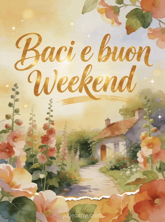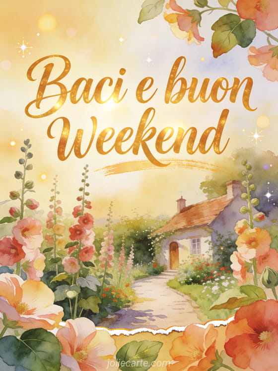 Augura un weekend luminoso con scritte fluide ad acquerello, malvarose oltre il bordo e un allegro sentiero di giardino cottage. Puoi inviare anche baci buon weekend immagine, baci ultimo weekend dell'anno o buon weekend baci immagini.