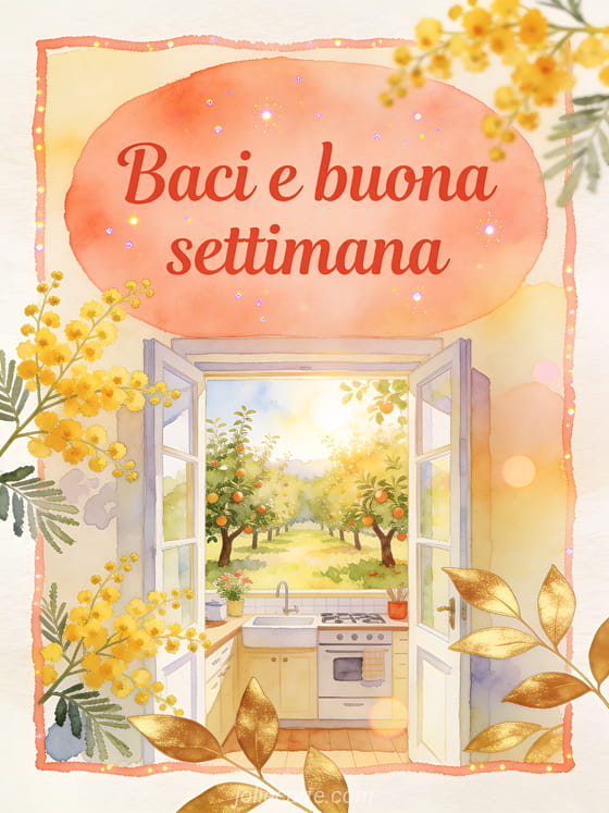 Condividi un saluto fresco per la settimana con scritte corallo, rametti di mimosa dorata, una finestra di cucina accogliente e un frutteto soleggiato in luce morbida ad acquerello. Puoi inviare anche baci del lunedì buona settimana, tanti baci buona settimana o buona settimana a tutti baci.