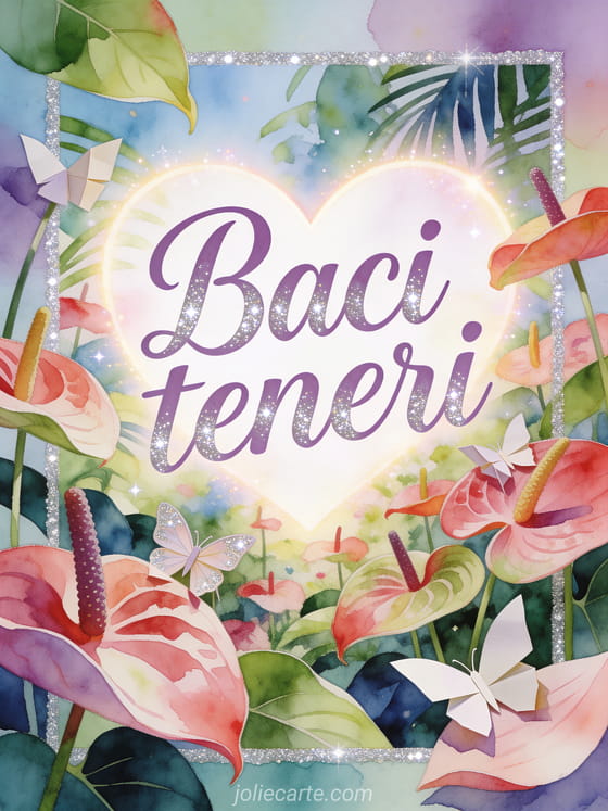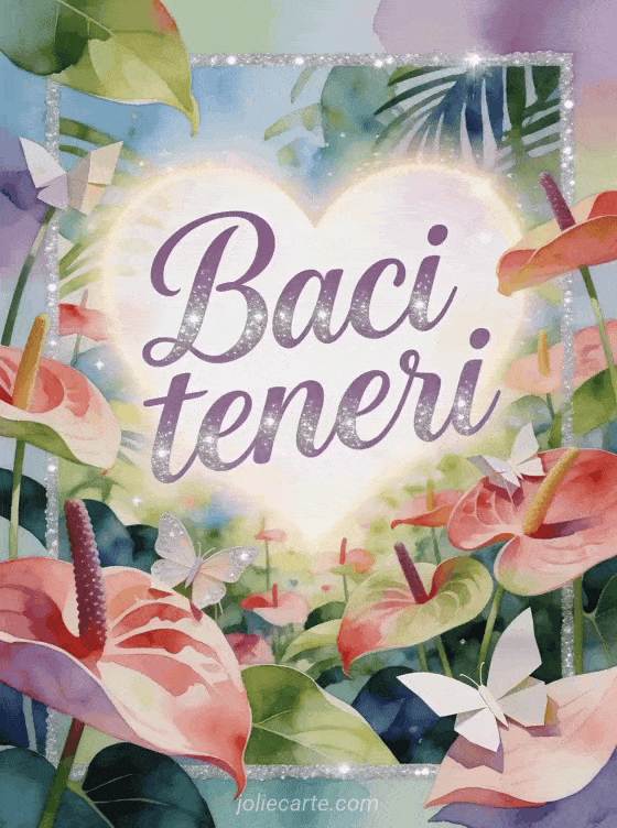 Condividi una gif di baci farfalla con morbida calligrafia malva, un giardino tropicale di anturi, cuori luminosi e delicate decorazioni di farfalle di carta tra i fiori. Puoi inviare anche un'immagine baci gratis, tanti baci gif animata o baci cane gif.