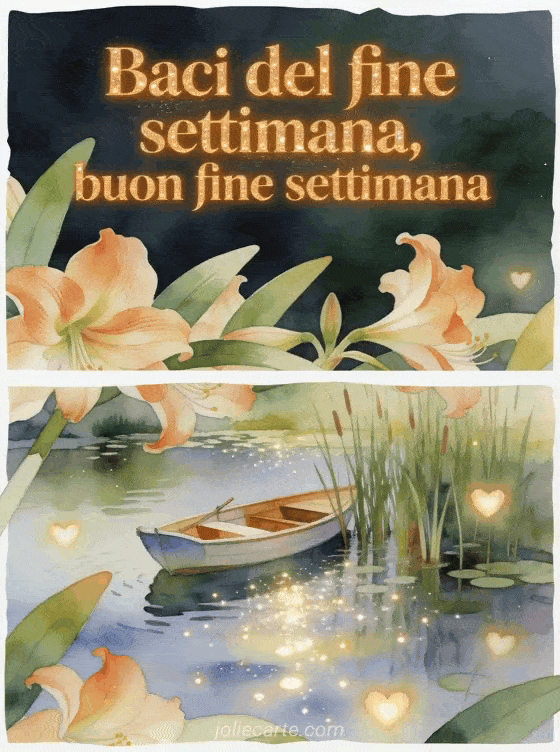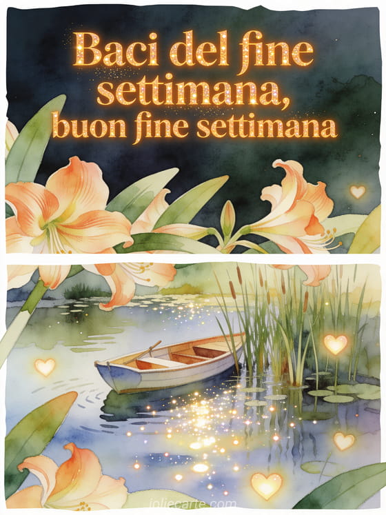 Condividi caldi baci del fine settimana con amarilli realistici in acquerello, una barca tranquilla accanto alle canne e luce scintillante sullo stagno. Scopri anche baci del weekend, buon fine settimana tanti baci immagine o buon weekend divertente umorismo.