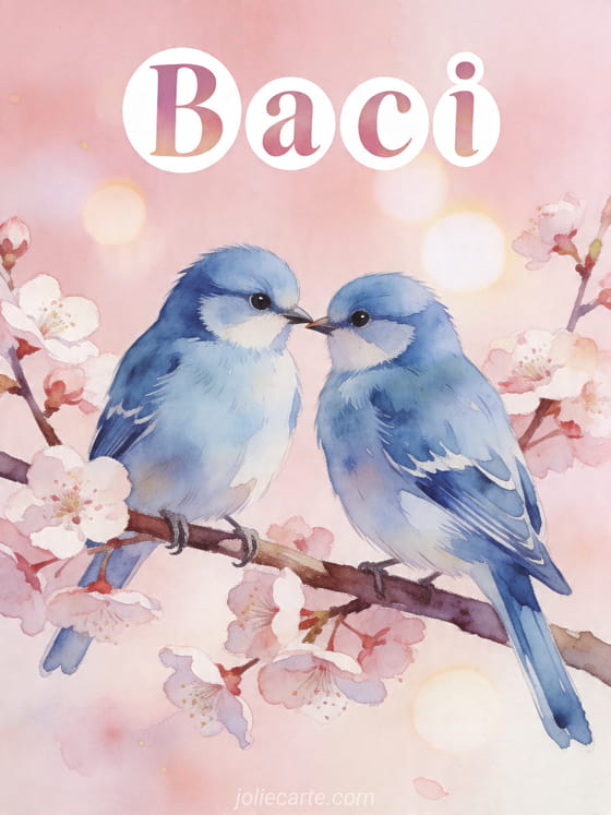 Condivida un tenero messaggio di baci con questo delicato biglietto che mostra due cinciarelle che si sfiorano il becco su un ramo di ciliegio in fiore. Scopra anche loghi animati baci, gif coniglio bacini o invio baci.