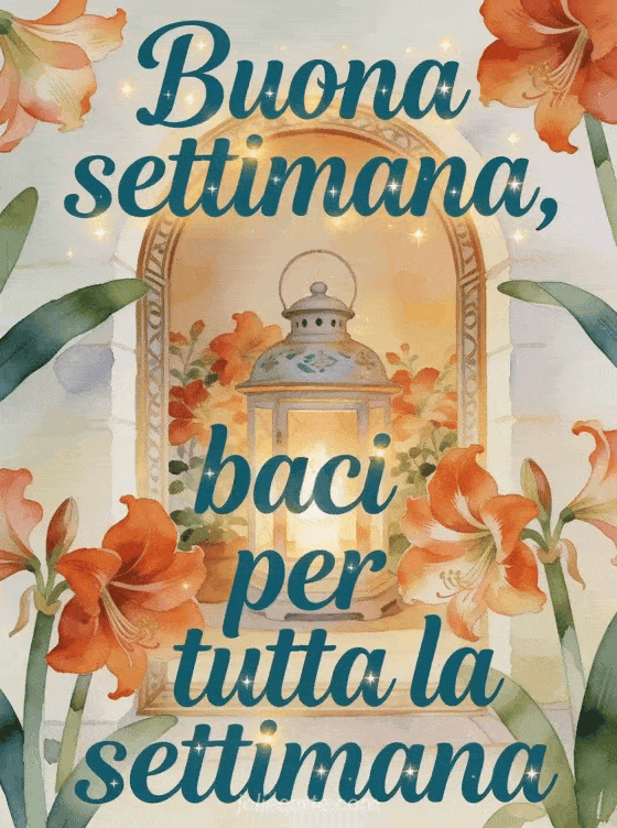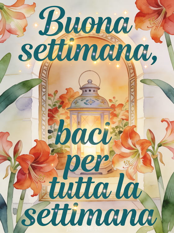 Condividi un caldo augurio di buona settimana con scritta verde petrolio scuro, una lanterna di ceramica, un arco accogliente e ricchi fiori di amarilli. Scopri anche buona settimana biglietto baci, cuore baci della settimana o belle immagini buona settimana baci.