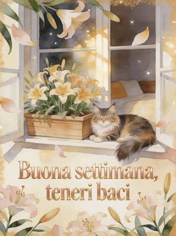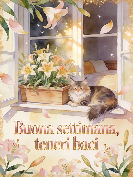 Augura una buona settimana con scritte oro rosa, un gatto Maine Coon accanto a una fioriera illuminata dal sole e emerocallidi nella calda luce dorata. Scopri anche una cartolina buona settimana a tutti baci immagini, una cartolina buona settimana baci gif animate o una cartolina gif buona settimana baci.