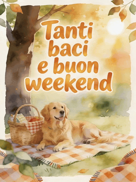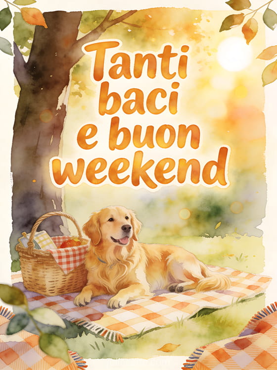 Augura un weekend gioioso con scritta giocosa, un cane golden retriever sotto un albero soleggiato, un cestino da picnic e una coperta a quadri. Scopri anche gif buon weekend bacioni, buon weekend farfalla baci o gif buon weekend baci.