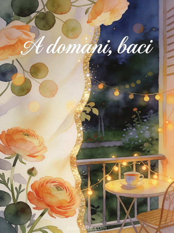 Condividi un saluto accogliente con scrittura crema ad acquerello, petali di ranuncolo oltre il bordo, un piccolo tavolo da balcone con una tazza e calde luci fatate in un tranquillo giardino serale. Scopri anche un a domani baci foto gif, un biglietto baci e a domani immagine o un saluto baci animati a domani.