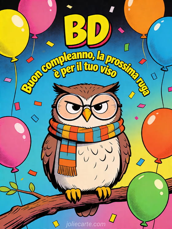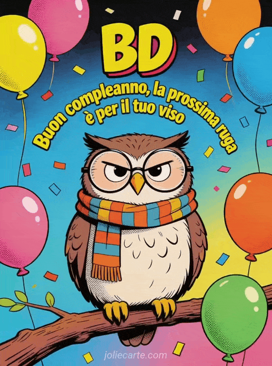 Fai sorridere qualcuno con questa cartolina di compleanno umoristica con un gufo brontolone ma adorabile con occhiali rotondi, palloncini e coriandoli. Puoi anche scoprire compleanno uomo umorismo, divertente biglietto compleanno uomo o gif compleanno uomo sportivo.