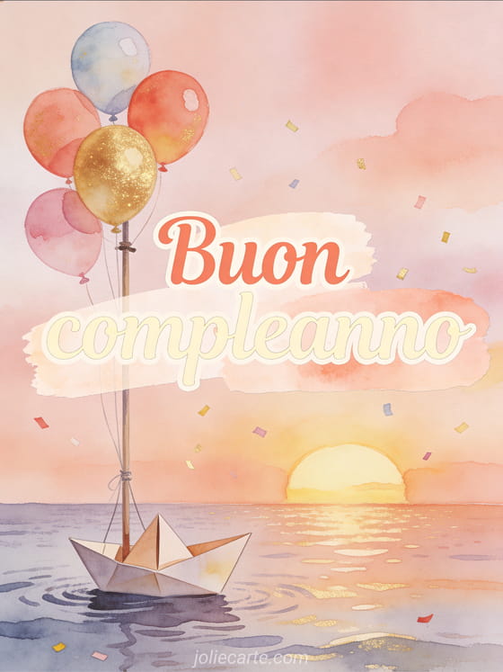 Invia dolci auguri di compleanno per un bebè con una tenera illustrazione di una barchetta di carta che naviga su un mare calmo, palloncini colorati legati all'albero, luce di tramonto pastello e coriandoli come spruzzi. Scopri anche buon compleanno mio bebè 2 anni, testo compleanno bimbo 1 anno o buon compleanno bimbo.