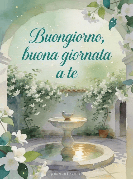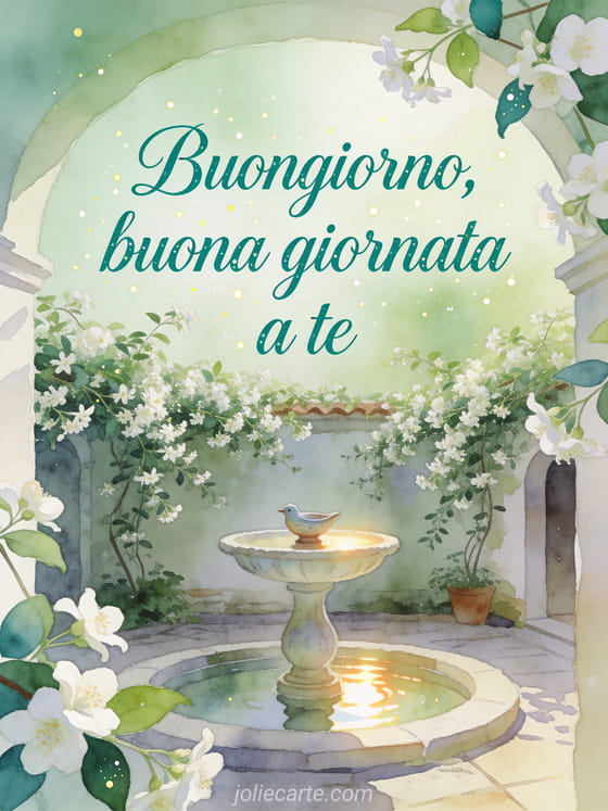 Invia una cartolina raffinata con una tranquilla fontana di cortile circondata da rampicanti di gelsomino e una piccola vasca di ceramica per uccelli. Scopri anche un messaggio di buongiorno alla sua ragazza, un messaggio di buongiorno toccante o un messaggio di buongiorno mattutino.