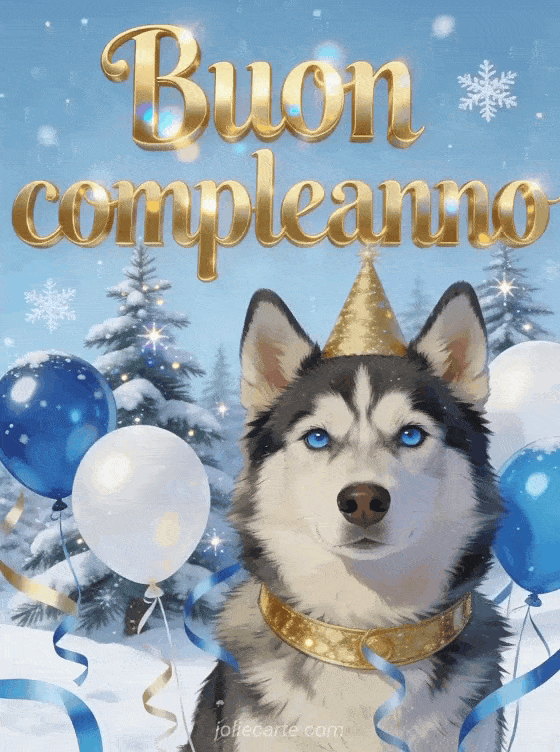 Questo bellissimo biglietto di compleanno animato per uomini mostra un husky dagli occhi azzurri penetranti con un collare dorato da festa, circondato da palloncini blu e bianchi e stelle filanti su un paesaggio innevato con abeti. Un biglietto allegro e incantevole per il compleanno di qualsiasi uomo. Scopri anche un biglietto di compleanno divertente per uomini o un bel biglietto di compleanno per uomo gratis.